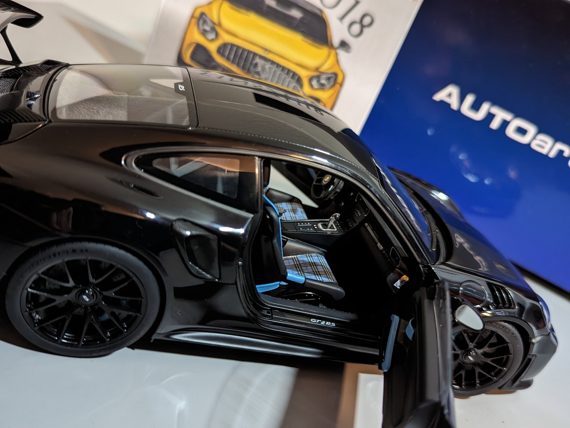 Der Porsche 911 GT2 RS (991.2) - individuell gestaltet mit hellblauen Akzenten innen und außen. Ob Bremssättel, Sitze, Türzuziehschlaufen innen - alles ist farblich aufeinander abgestimmt. Im Innenraum sind außerdem Bezüge im Karomuster-Design auf den Sitzflächen verbaut - natürlich farblich passend zu den hellblauen Akzenten im Interieur abgestimmt. Ein hellblauer Überrollkäfig rundet den sportlichen Auftritt ab.