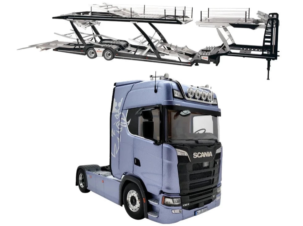 Scania V8 730S 4x2 Fictionblue mit Greif Logo & Lohr Autotransporter